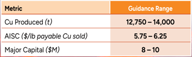 Costs are forecast to ease in H2 2026 when increased mining rates drive lower unit operating costs. All-in Sustaining Cost guidance for 2026 of $5.75-6.25/lb payable Cu sold (US$3.80-4.19/lb).